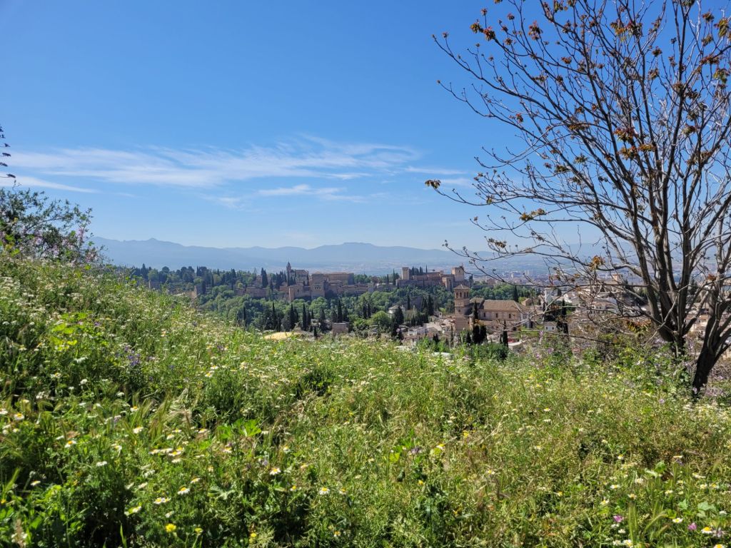 Vad ska jag säga, så vackert. Lite alpkänsla. Grönt, gula blommor, blå himmel, snöklädda berg. Blir salig. Få biljett till Allhambra är nog mission impossible. Fullbokat till lmaj. Men det finns så mycket annat att se. Blir en lång tur i morgon. Härliga 2 dagar i Grenada, många långa promenader. Betat av en hel del på min ”lista”.