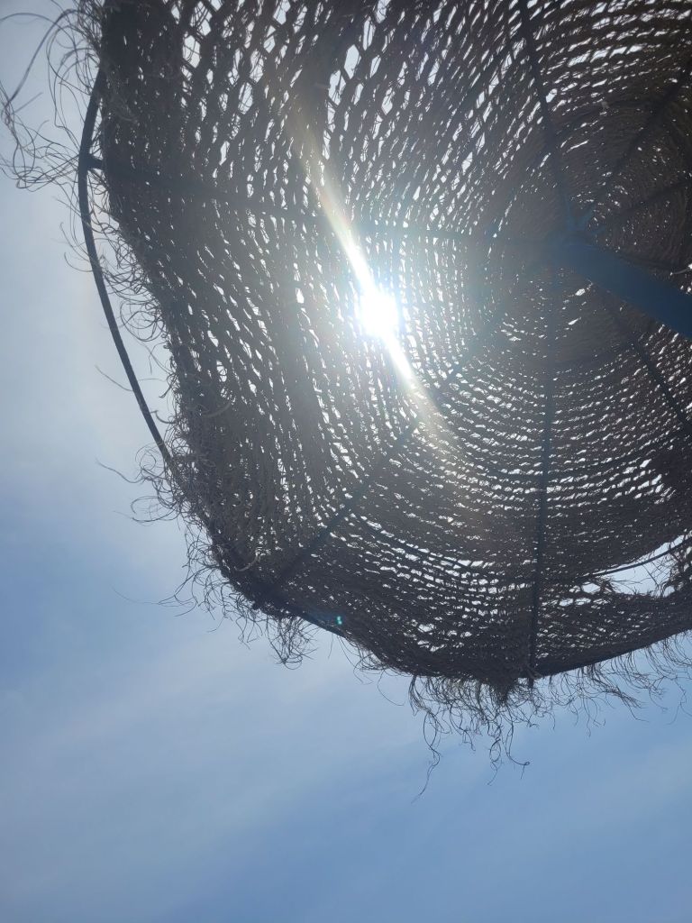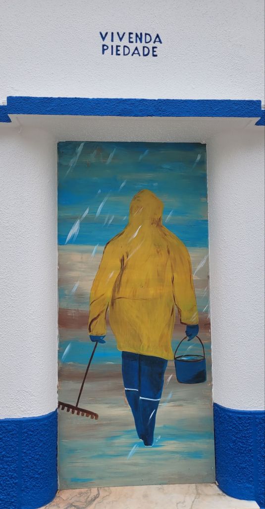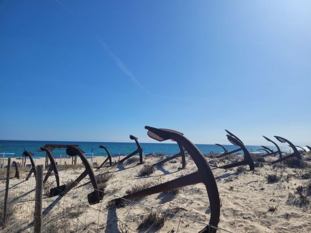 En kaffe på ”mitt” gamla hotell i Farol innan jag gav mig ut på strandpromenaden. Hade planlagt att gå till Costa Nova och ta bussen tillbaka därifrån. Vädret blev bättre och bättre, men blåsigt. Hittade lä, vid sidan av en stängd strandbar. Blev ett par timma i solen där. Kontraster, jag i bikini och människor väl påklädda som kom på strandpromenaden. Har man lä så är det underabart skönt. Vandrade vidare. Kom tyvärr inte hela vägen fram. Avstängd, De håller på att bygga ny strandpromenad och ösa sand hit och dit. Så fick gå ned mot början av Costa Nova.