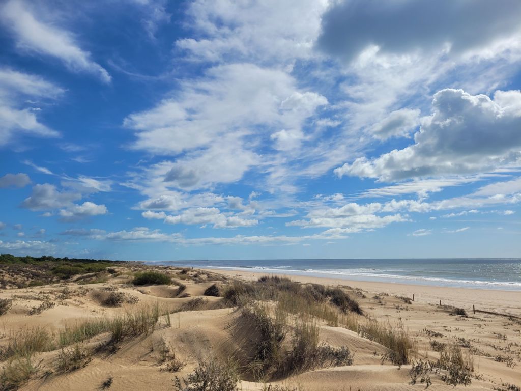 Sitter på en strand, liten utmaning att ta sig hit. Men så värt, en i princip öde strand, där det är havets ljud som dominerar. Fåglar då och då. Atlanten framför mig. Rofyllt.