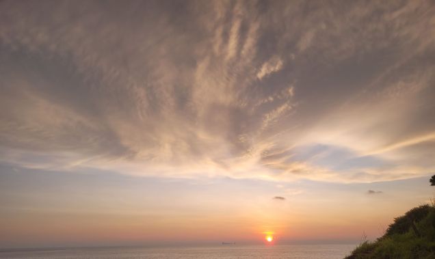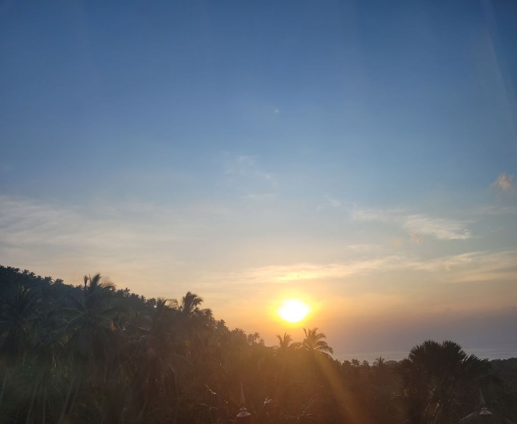 Anna hade gjort research över var jag skulle bo. Hon vet vad hennes mamma vill ha. Så hade bokat in mig på Bale Sampan Bungalows. Ligger på östra sidan, ca 10 minuter att gå från piren. Första intrycket var sådär. Ganska nonchalant kille i repan. Men han fick sig en knäpp på näsan när jag gick tillbaka efter att ha kommit in i min bungalow. Dåligt städat. Jag kan ta lite, men här var det för många grejer som hade missats. Men se då var det att bli struken medhårs, när jag nämnde att jag är i samma bransch. Så Bale Sampan, är faktiskt ett mysigt ställe. Tror det är 13 bungalows totalt. Lugnt och tyst. Massor av grönt och vackra blommor som omgärdar vägen in. En liten pool och egen strandremsa. Har ett café med nyttig mat. Packade upp och gav mig iväg på en ”liten” upptäcktsfärd, innan jag skulle möta upp Anna och Justin. Men ”liten” tur blir oftast ganska lång, när jag ger mig iväg. Jag och kombon Google Maps är inte direkt synkade. Skulle korsa ön, från öster till väster. Gick genom byar där locals bor, hästar, höns, kor. Hade föredragit att gå i gympadojor, men ”life is better in flip flops”. Kom i alla fall så småningom ut på ”andra sidan”, vid Sunset riding. Hann se lite av solnedgången, lite disigt men ändå så vackert.