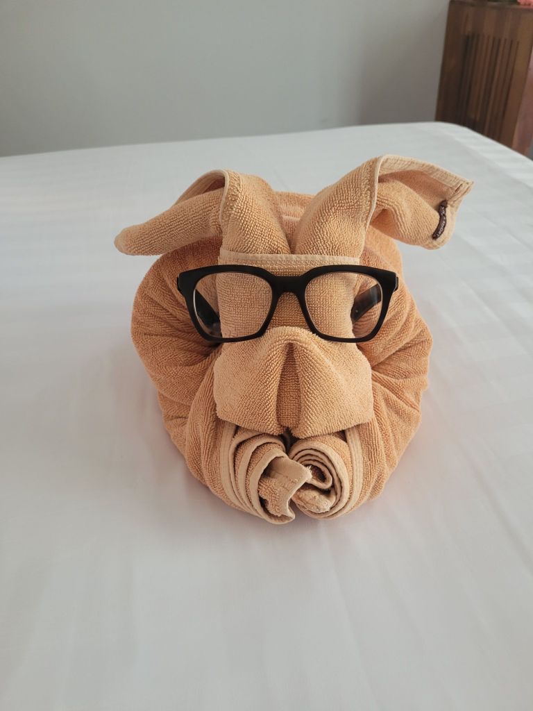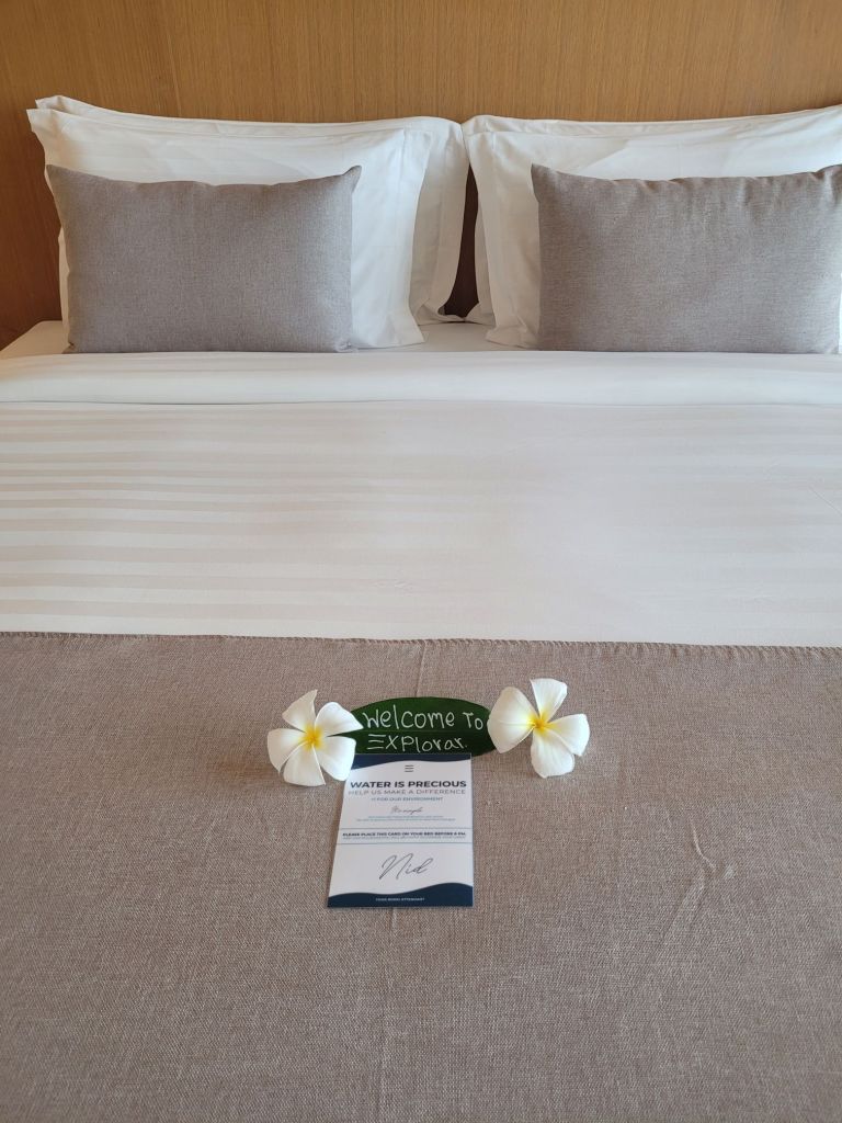 -fick inget dagligt städ, trots att jag tänt skylten. Inte hela världen. Kändes som att personalen hade fullt upp med att pynta inför ljusfestivalen. Alla rum fick varsin krutong att ta med till stranden, tända och släppa i havet. Tyvärr, jag gör inte det, är tillräckligt med skräp i havet.