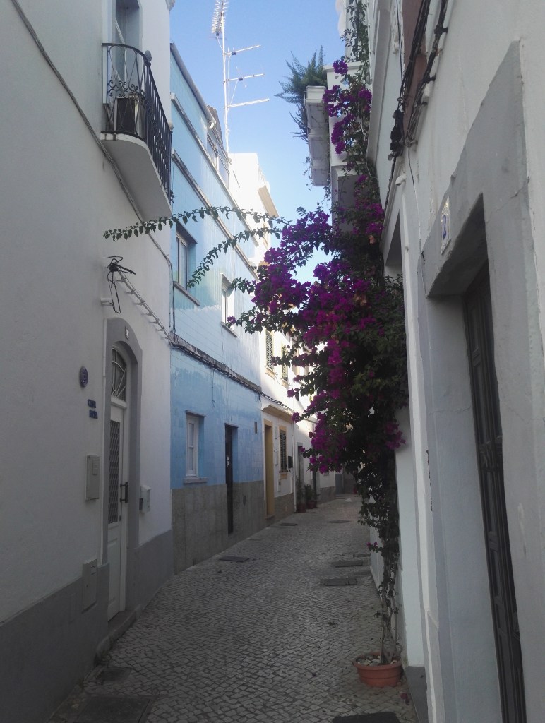 Jag bor i gamla stan i Olhao. Ingen trafik är tillåten här. Så vackert, blommor, fina gator, vänliga människor. Män som sitter runt bord, dricker kaffe och löser livets gåtor. Grannar som flyttar ut sina bord och stolar på gatan, äter gemensamma middagar sent om kvällarna. Har svårt att anpassa mig till dessa sena tider man äter middag här. Jag har ju nästan gått och lagt mig när de börjar käka. Ja ja, olika är bra.