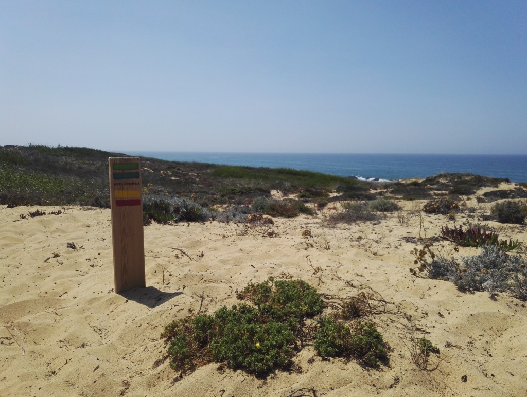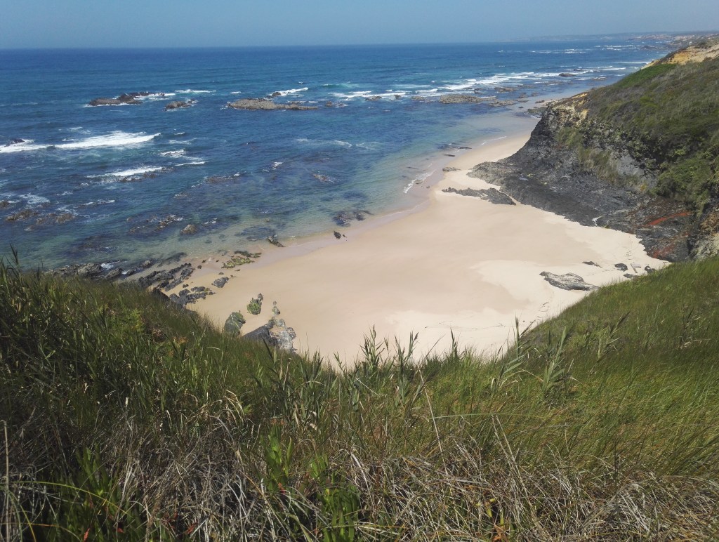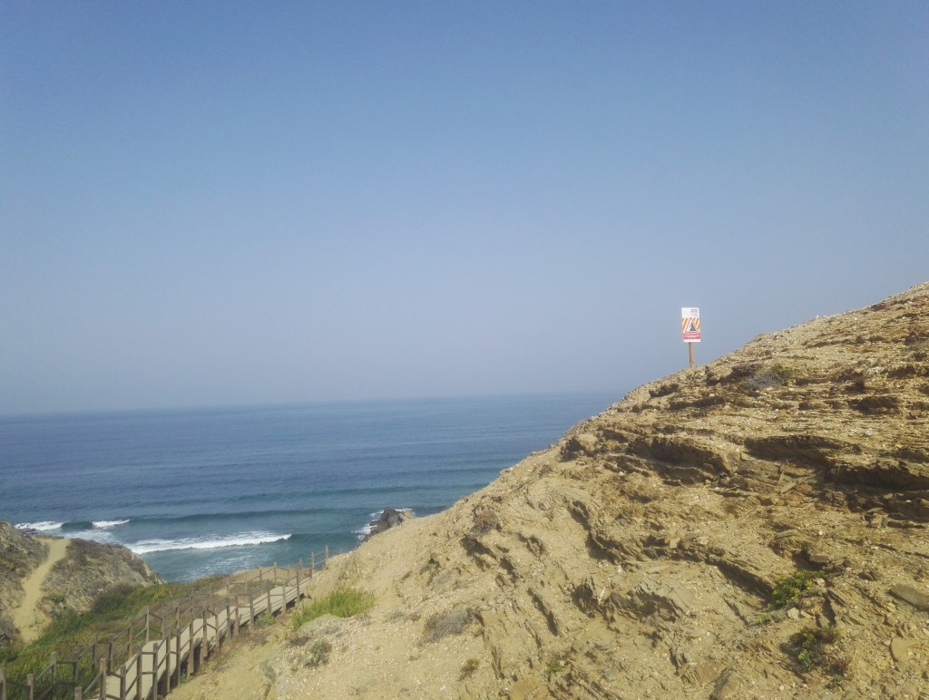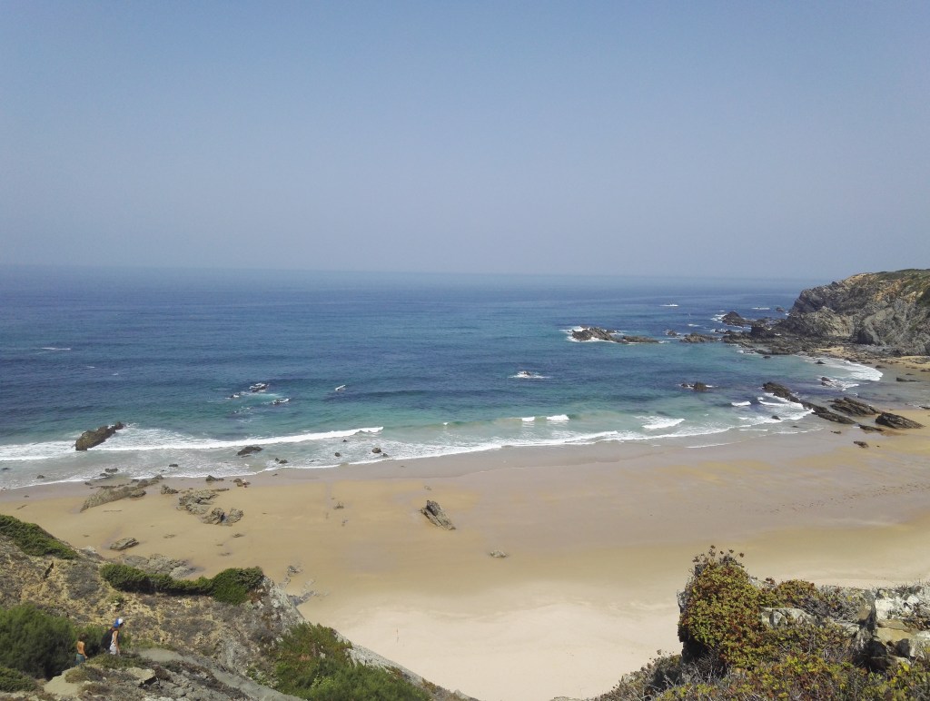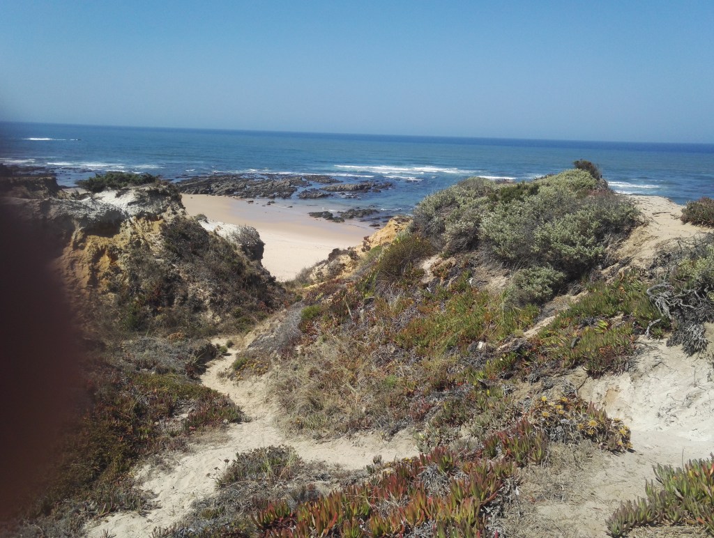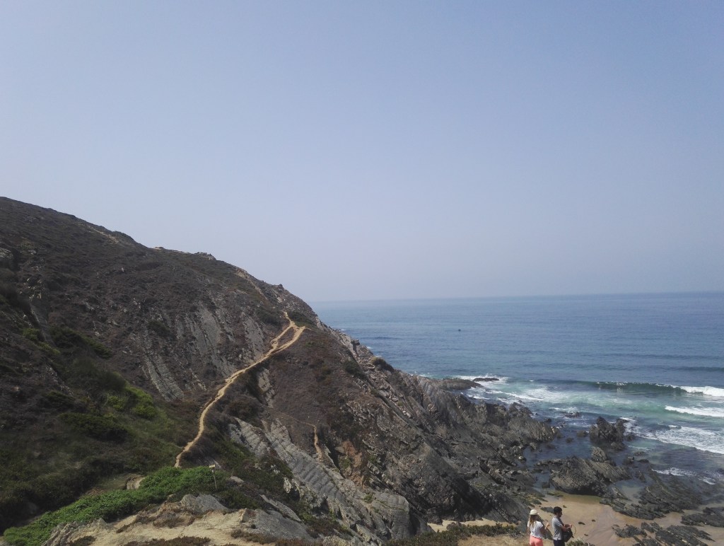 Håller med ett par jag träffade i Odezeixe, att den här sträckan är riktigt tråkig. Bara grusväg, där massa bilar kommer och kör, på väg till olika stränder. Efter en stund kommer lite variation. Kommer nog lite lost, men så hittar jag tillbaka till leden igen. Följer blå/grön fisherman. Startade med vit/röd Historical. Lite roligare att gå, en bit i alla fall. Sedan kommer en jobbig sträcka, massa sten, gäller att hålla tungan rätt i mun. Har verkligen inte lust att stuka foten här. Möter mer och mer vandrare. En del balanserar i flipflops. Är ni helt korkade eller…..