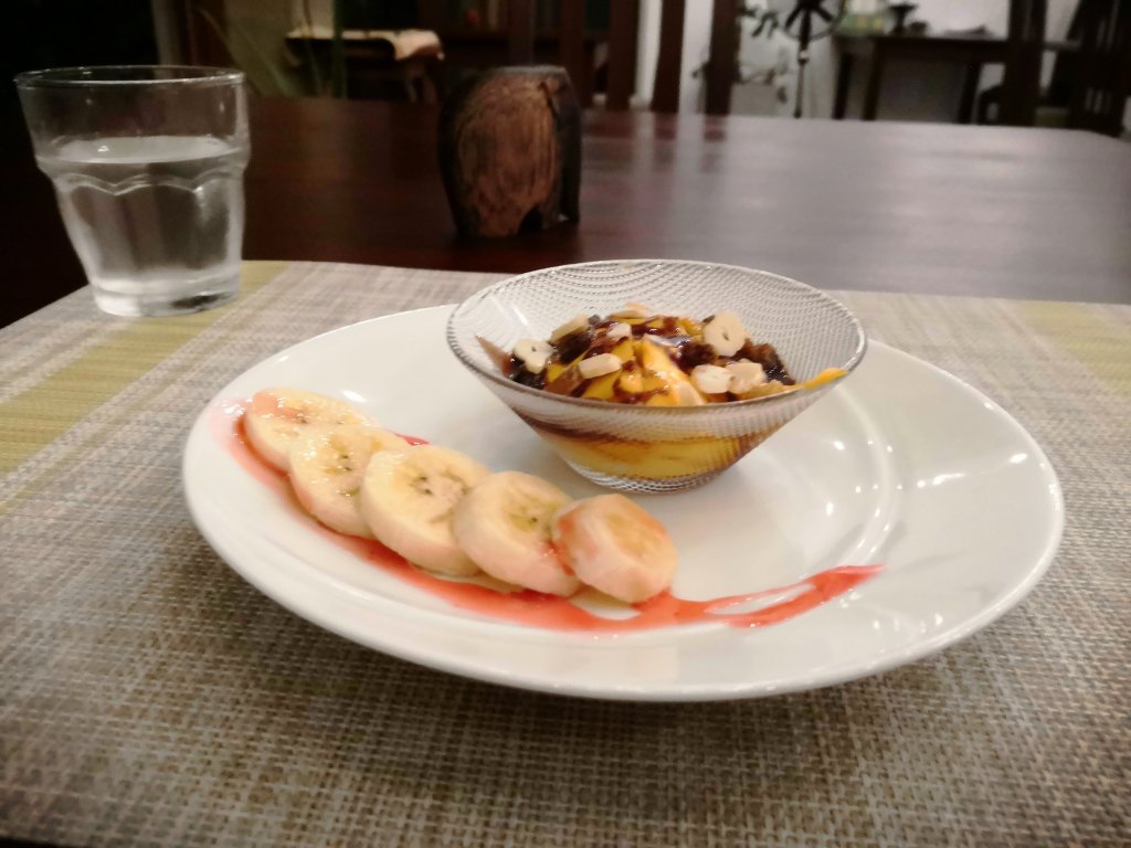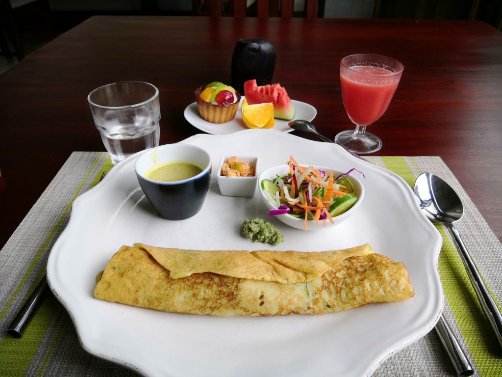 Frukosten var helt ok, ingen buffé. Fullt förståligt med så få gäster. Blev mer traditionellt med frukt, juice, kaffe och slog till med äggröra och sallad. Det var gott men långt ifrån Coza Ceylons nivå, sorry.