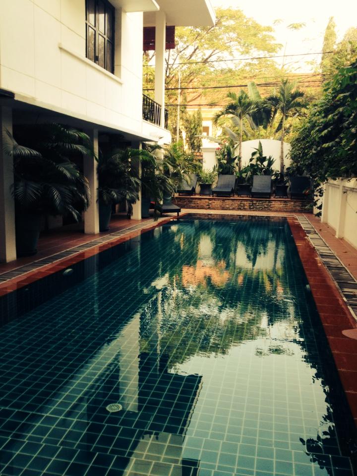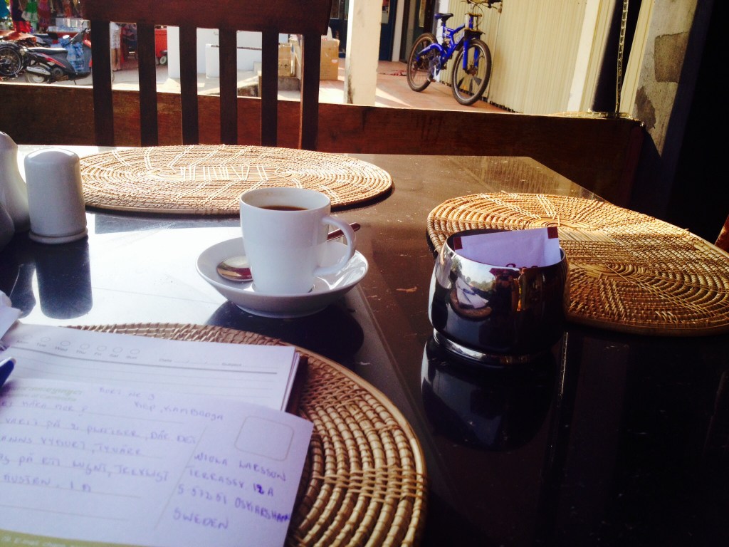 En liten reflektion över transporter i Kambodja, eller överhuvudtaget i Asien. Tider vad är det? Struktur och planering, vad är det? Man måste vara väldigt flexibel och räkna in en timme bakåt och en timme framåt när man ska bli hämtad. T ex igår. Skulle bli hämtad 7.30 vid hotellet i Kep. Minibussen kom 7.15. Ner till uppsamlingsplatsen, alla ut ur bussen för vi skulle byta. Ut med bagage. För att 5 minuter senare bli kommenderad att gå på samma buss som vi precis klivit av. Den här historien upprepar sig och jag kan bara skratta åt det. Men det är många som blir riktigt upprörda och gapar och skriker. Men varför ödsla energi på det. Acceptera det du inte kan påverka. Första bytet blev i Kampot, där jag hann med 2 byten innan det blev rätt minibuss mot Phnom Penh. En läxa har jag lärt mig. Ska i fortsättningen i möjligaste mån undvika minibussar, åka med stora bussar i stället. De trycker in folk så dörrarna nästan buktar ut och verkar alltid lika förvånade att resenärer har med packning. Kom till Phnom Penh strax efter lunch. Delade en tuktuk till hotellet, La Librairie, ett litet hotell med karaktär och egen stil. Riktigt mysigt ställe, hade till och med en terrass.