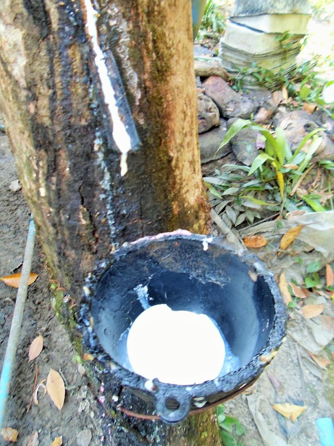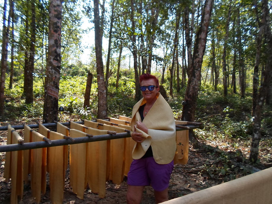Väl uppe på plantagen där en kvinna och man bor och sköter plantagen. Fick se hur tillverkningen gick till och fick även prova. Dom får 60 bath/kilo. En platta väger 2 kg. Om jag förstod honom rätt säljer dom 6500 kg/år. De skördar träden, heter det skördar, tappar heter den nog, 3 dagar på raken och så en dag fri. Blev bjuden på kaffe och så hade vi en fruktstund.