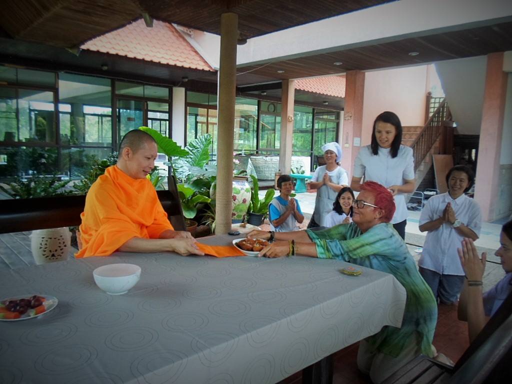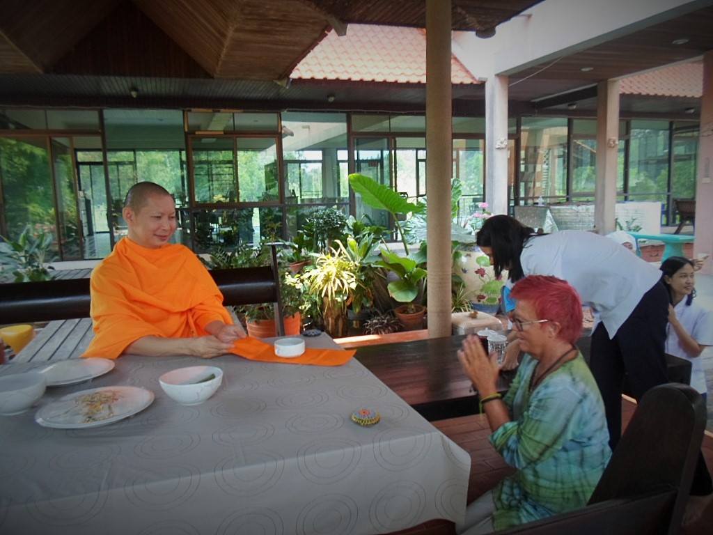 De hade ordnat med bussbiljett till Bangkok och körde mig till bussen för att ta farväl. Fantastisk service från dessa underbara människor. Så nu mot Bangkok. Södra Bussterminalen ligger en bit utanför city, blev taxi till mitt hotell. Pratade mycket med chauffören, ”Mr Big” Då jag berättade vart jag skulle, pratade vi mycket buddism. Intressant samtal. Men han var väldigt negativ till just Dhammakaya Temple dit jag skulle. Jag skulle ju inte vara direkt i templet utan på POP house, som drivs av The Middle Way Organisation. Men naturligtvis hänger de samman. Tog till mig det ha sa och tänkte att det här får jag kolla upp senare. Nåväl, framme i Rangsit, där hotellet låg. Checkade in och började leta efter mobilen. Fanns inte, attans attans. Hur ska jag komma i kontakt med taxin? Förstod att jag hade glömt den där. Men kom på att jag fått visitkort av honom ”Mr Big”, så med hjälp av en snäll kille kunde jag ringa upp och mycket riktigt hade jag glömt den. Låg på golvet i bilen. Han sa att han skulle vända om. Men jag var lite skeptisk om han skulle göra det, tiden gick och jag började inse att jag nog hade sett mobilen för sista gången. Försöka tänka ut lösningar, men tänkte oxå att han verkade vara en riktigt sann buddist och då kommer han tillbaka. Mycket riktigt, han ringde till och med och sa att det skulle dröja lite till på grund av trafiken. Så glad jag blev att få se honom. Det finns ärliga människor. Tacksam