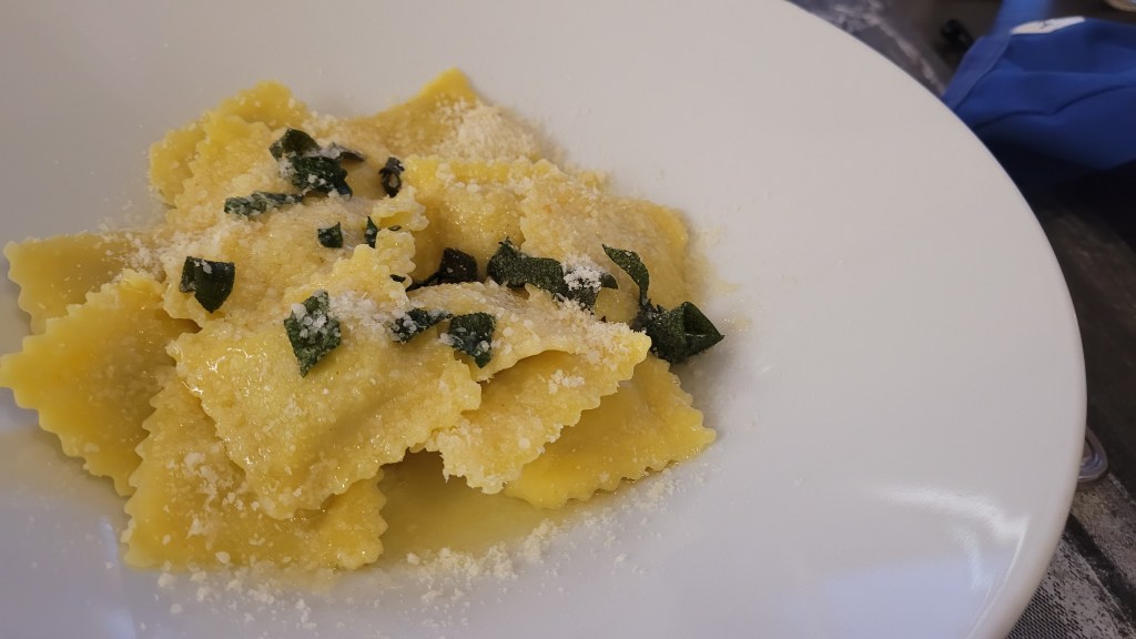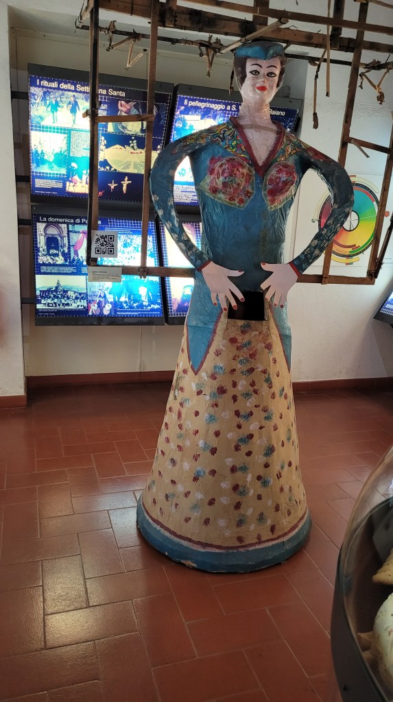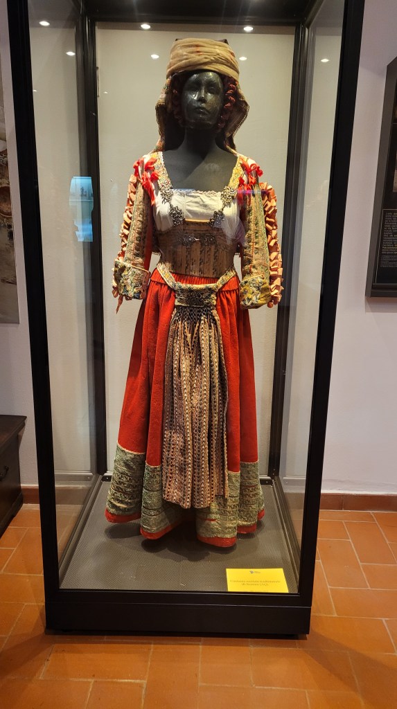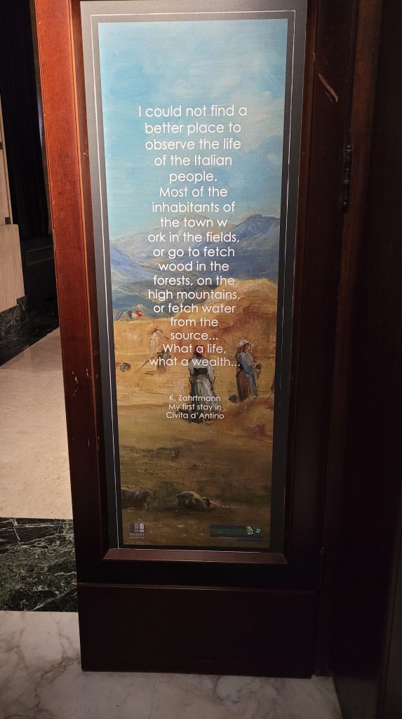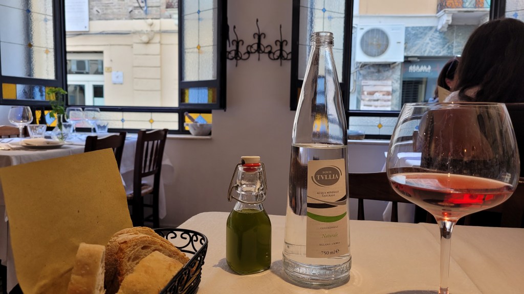 Efter frullen gav jag mig ut, med Matteos lista i handen. Först mot gamla stan, över bron. Första stoppet var Museo delle genti Di Abruzzo. Lite folk. Skönt. Laddade ner, så jag kunde lyssna mig igenom de olika rummen och historian runt området. Väl värt besöket. Kultur retar aptiten, så efter museet var det lunchdags. Tog en av Matteos rekommendationer, Taverna 58. En gammal, anrik restaurang. God lunch. Först en slags bruschetta on the house. Pasta med tomat och panchetta till huvudrätt. Rosévin. Som dessert deras egen tårta, som serverades med en god likör. Även den on the house. Mätt och belåten ramlade jag ut i gränderna igen.