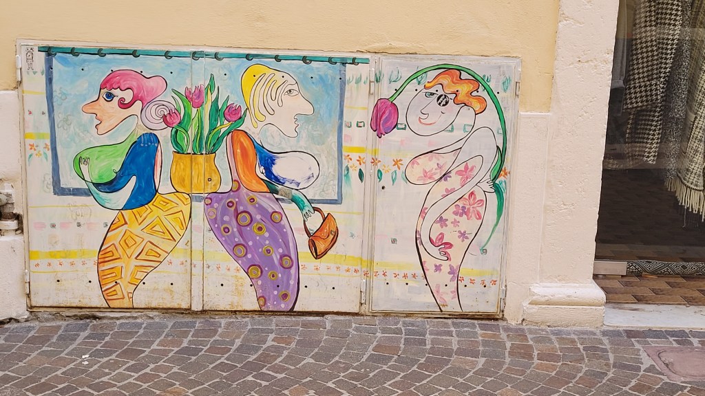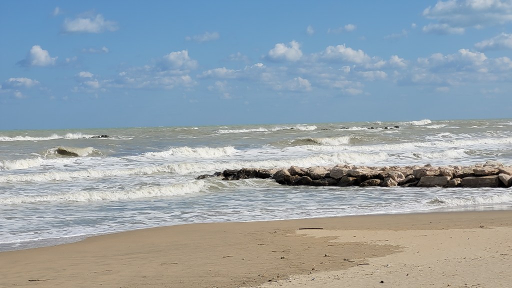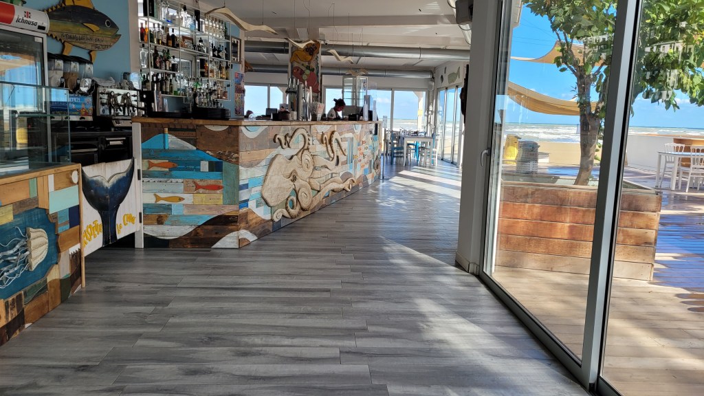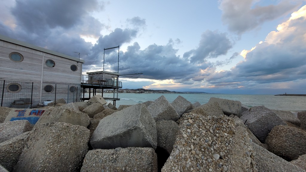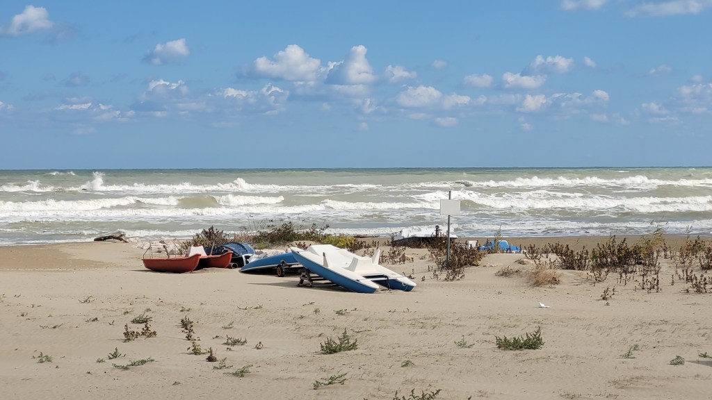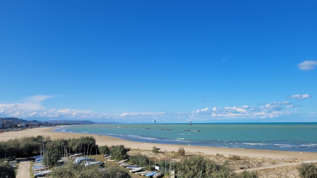 Idag gjorde Barbara scrambled egg till mig. Så snällt och så gott. Det här stället överträffa all förväntan. Idag har jag bestämt mig för att bara ut och gå. Låta hjärnan få vila. Så efter snack med Matteo och Barbara gick jag mot norr via en gata, som blivit en gågata. Tack vare ockupanter. från början var det tänkt som en gata för elbussar, därav ledningarna som går över vägen. Men så blev det inte. Ibland hjälper det att protestera. Gick och gick längs denna allé, men så ville jag se havet. Då hade jag nått ända till Monte-Silvano, ca 9 km. Blåste nu rejält, övergivna stränder, i vila inför nästa sommar, lite vemod i det. Kan se framför mig hur packat med folk det varit på stränderna. Tog skydd i en, ännu öppen strandrestaurang, från regn och blåst. Blev lunch, gnocchi, vitt vin och gokaffe.