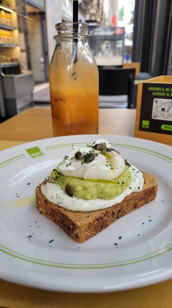 Stället där jag ska bo, B&B Le Stanze Du Bruno, ligger nära tågstationen. Som vanligt gick jag åt motsatt håll. Jag och Google Map, inte så kompatibla. Matteo mötte mig i entrén, mycket trevligt välkomnande. En kaffe och snack. Han skrev ihop en lista med sevärdheter och restauranger. Vilket värdskap! De har 2 rum (jag är den enda gästen just nu), bor i det blå rummet. Mysigt inrett. Balkong. Packade upp och gav mig ut. Första stoppet blev hälsostället Seed Superfood. Avocadotoast med pocherat ägg och en supergod juice.