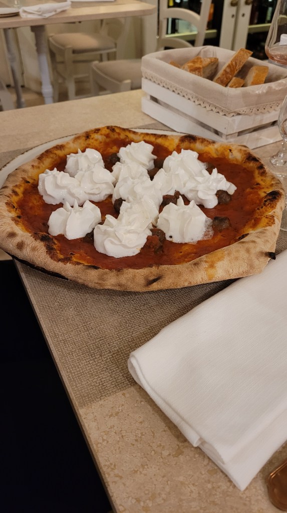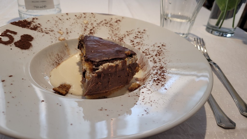 Vi, Donatella och 2 vänner till henne, åkte till restaurangen ”Le Maschere”, där hennes man, Giovanni, är kökschef. Det visade sig att den ligger mitt emot Taverna 58, där jag var igår.. Mysigt ställe, inte många platser, som serverar både a la carte och pizza. Smart drag. Blev bjudna på ett par olika starters. Vaktellår med valnötter och friterad ostboll med så på gula tomater. Jag hoppade vakteln men bollarna smakade mycket bra. Jag beställde en pizza med stark sås. Jättegod, men orkade verkligen inte med hela. Är inte van att äta så sent. Men dessert går ju alltid ner. Chokladmousse, svingod, inte så söt. Vi drack rosé till, som fylldes på hela tiden. Mycket trevligt. En av tjejerna är ”hooked” på Sverige. Vill flytta dit, har tom pluggat svenska. När vi skulle betala slutade notan på 20 Euro vardera. Tack, tack ,tack. En härlig kväll, mycket prat, skratt på en typisk italiensk restaurang, där alla åldrar, från barn till äldre, var blandade.