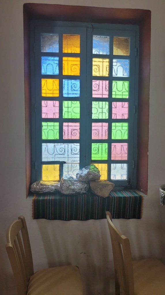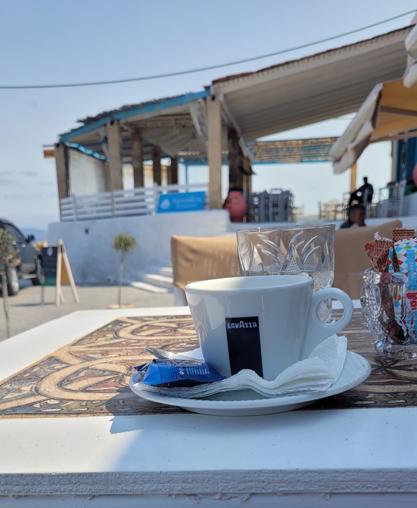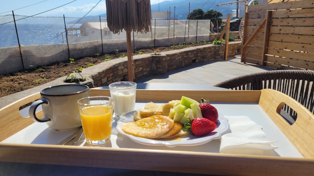 Nu är det helg och frukost serveras här, då det är lite weekendgäster. Wow, vilken frukost. Mer som brunch. Massor av läckerheter, grekiska sådana. Ägaren (glömt namnet) var på plats och förklarade vad jag fick.