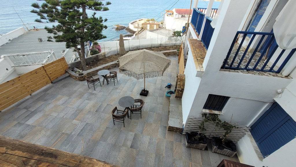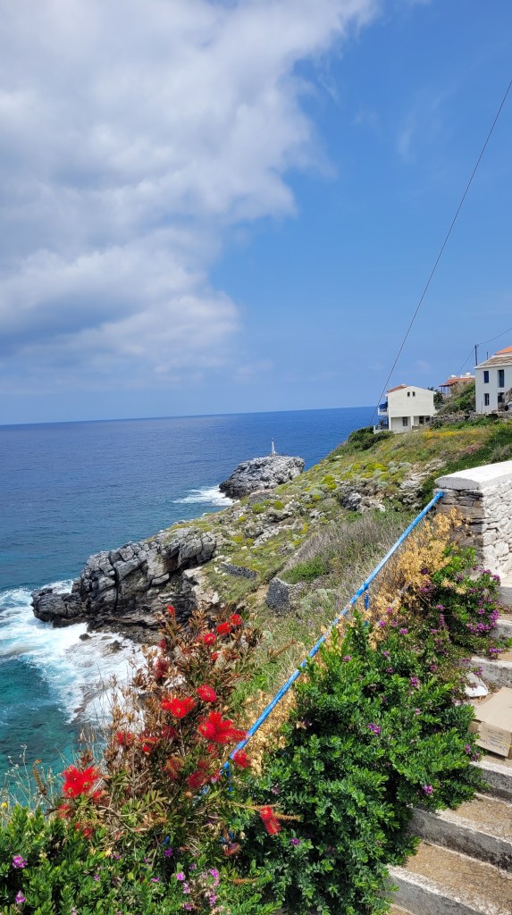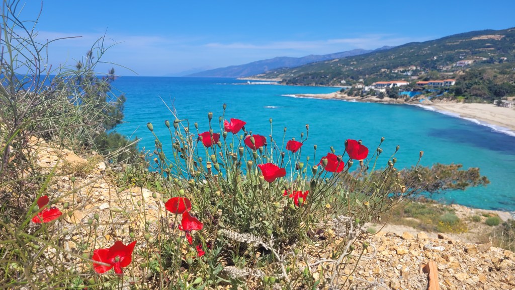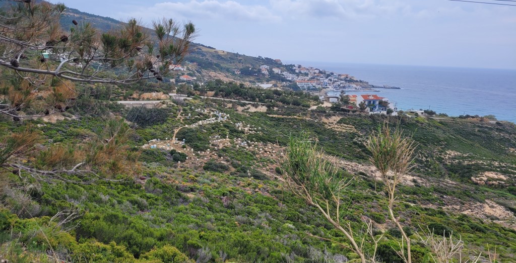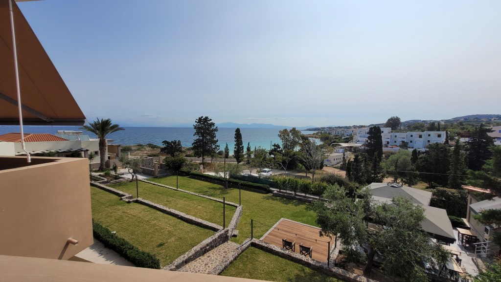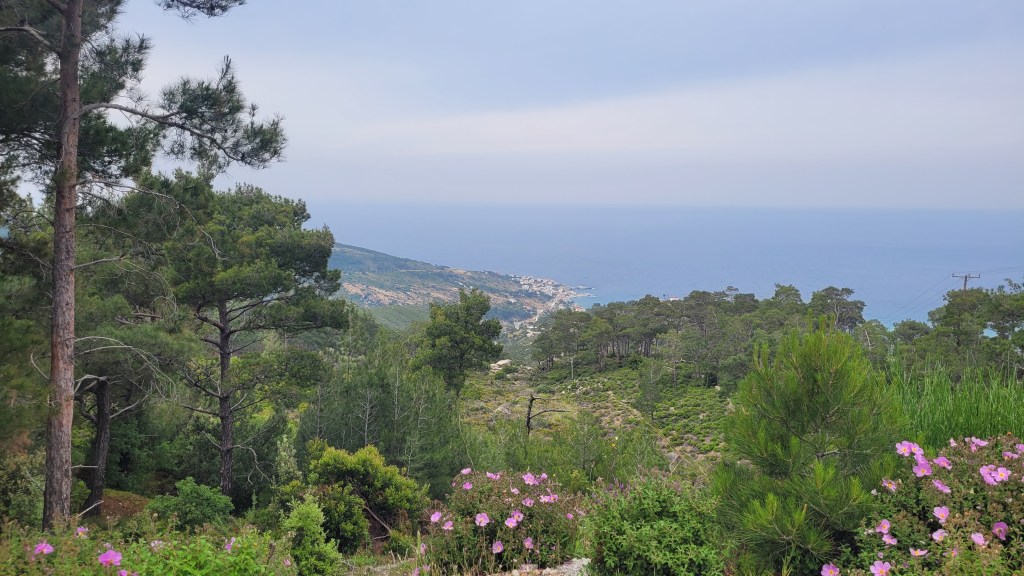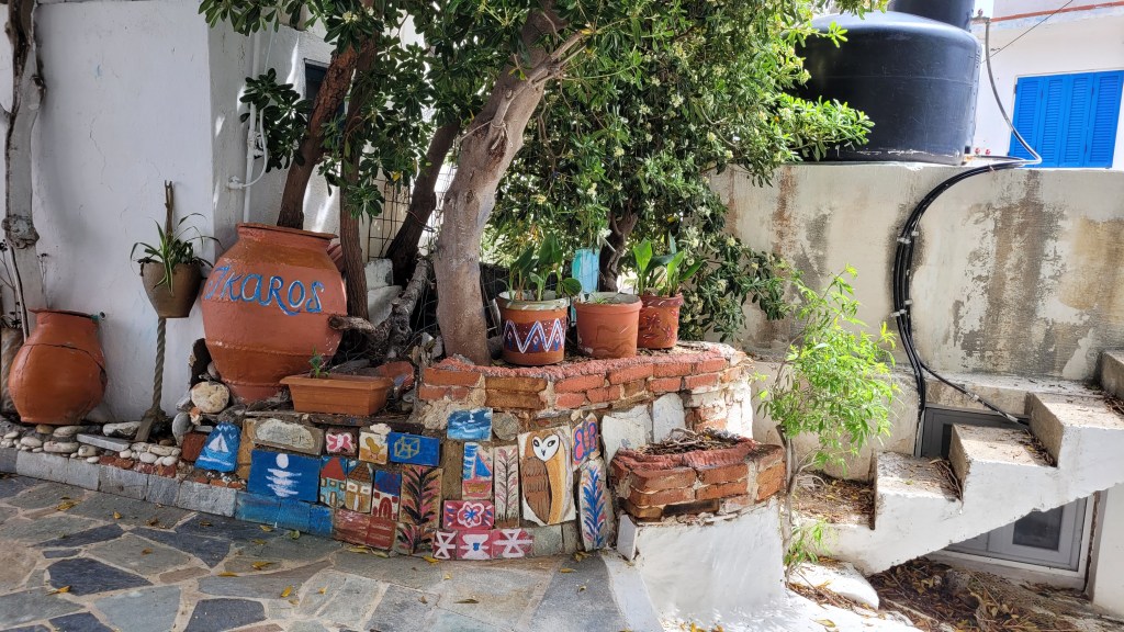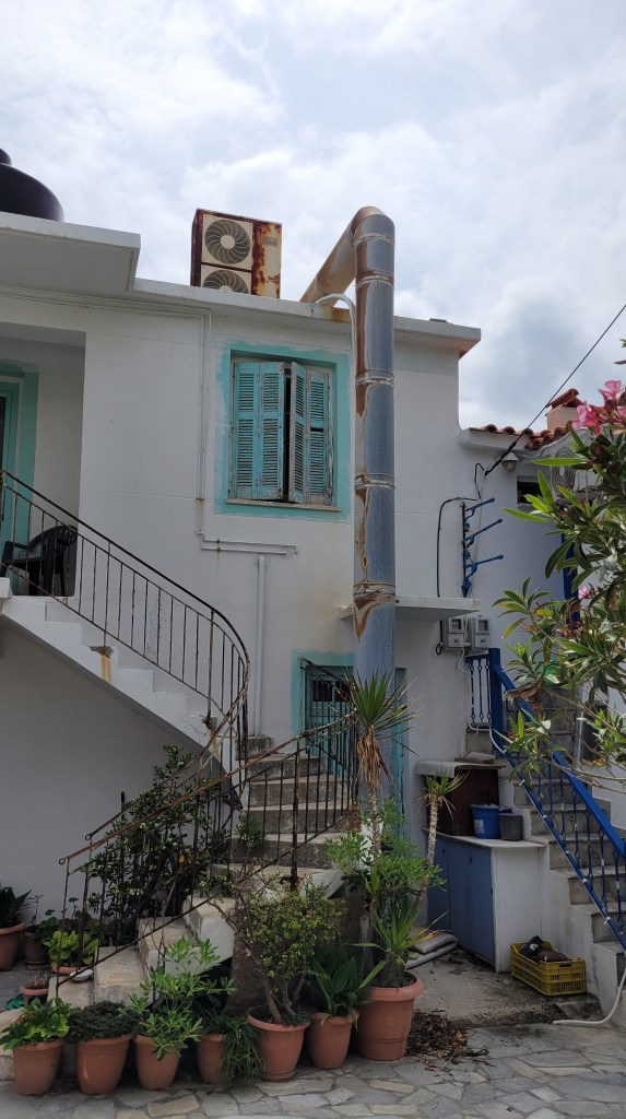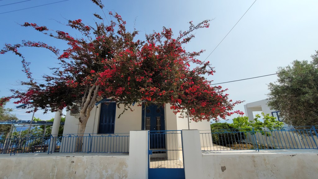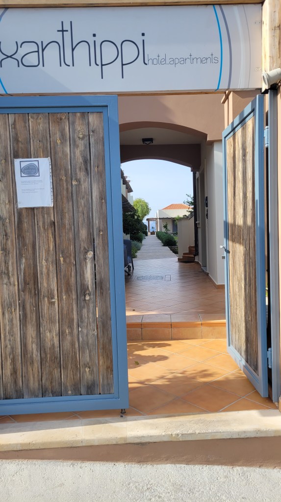 En taxi från piren till ”min by” Souvala och Xanthippi Hotel. Söta och trevliga Vera mötte mig där. Då jag tydligen är enda gästen, inte första gången det händer, är det ingen frukost här i morgon. Härligt ställe, ett stenkast från stranden. Vackert med massor av blommor och grönt.
