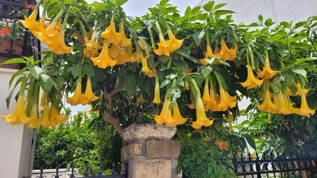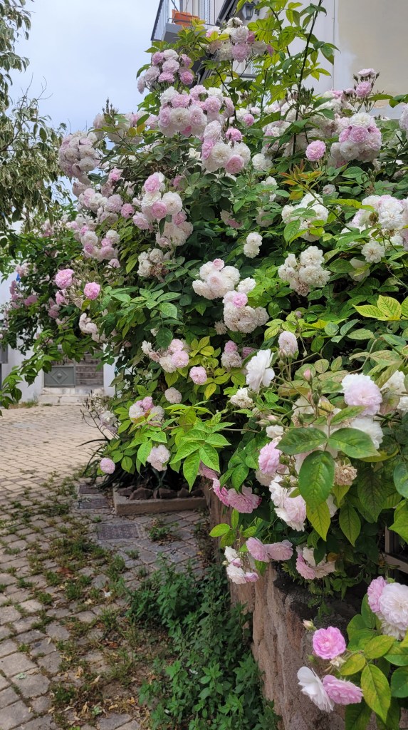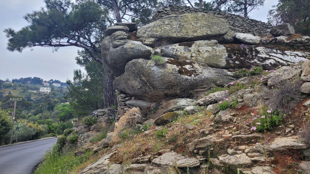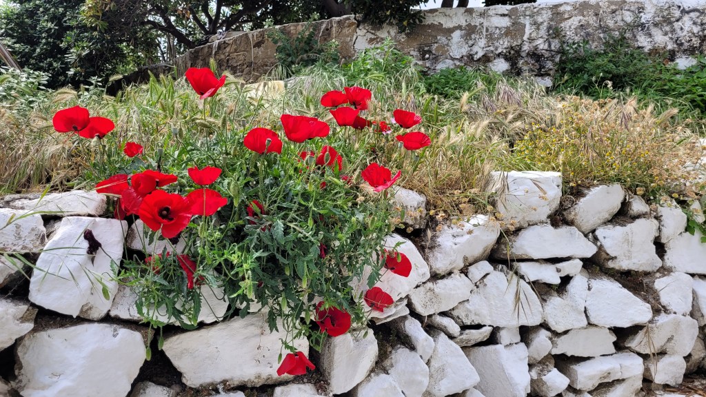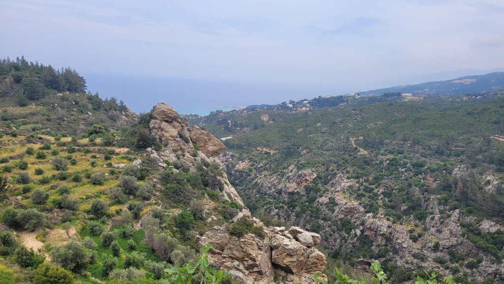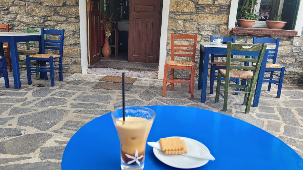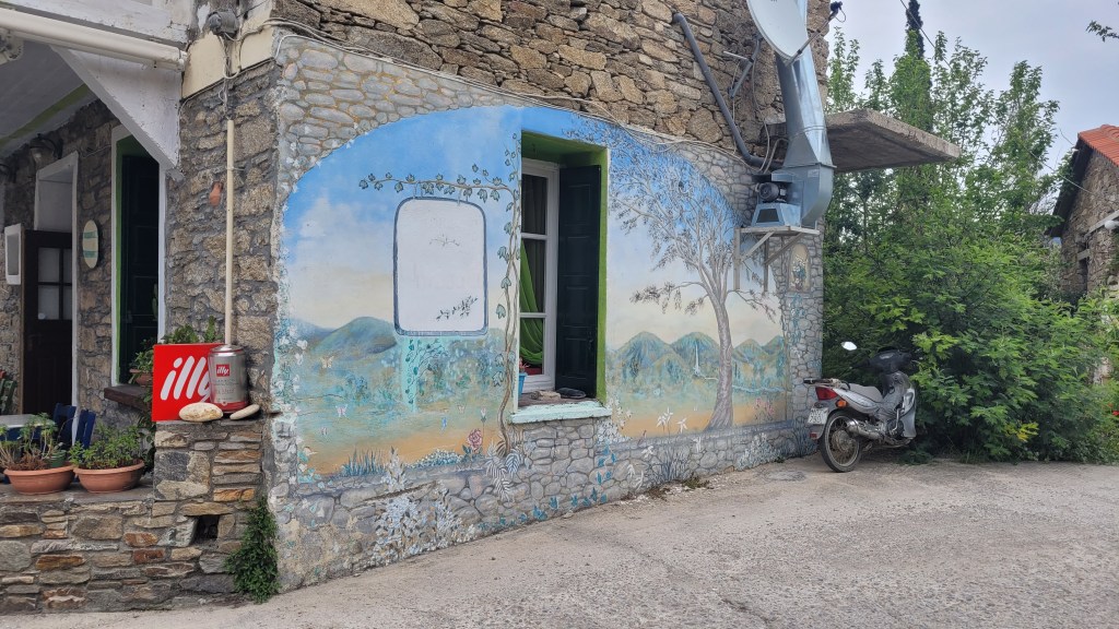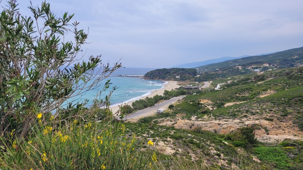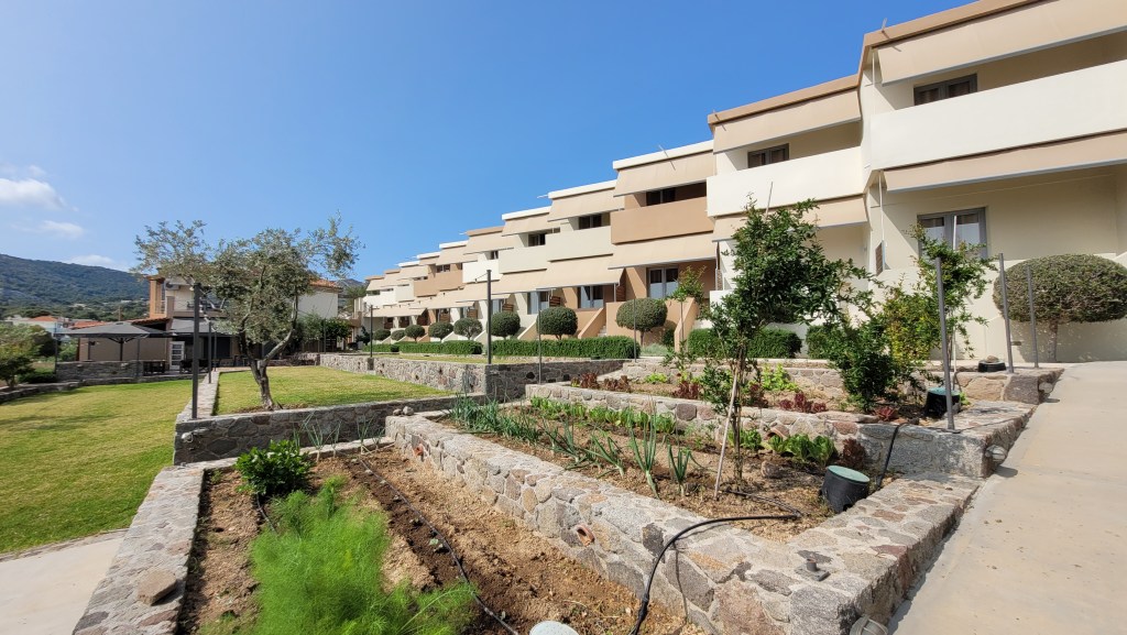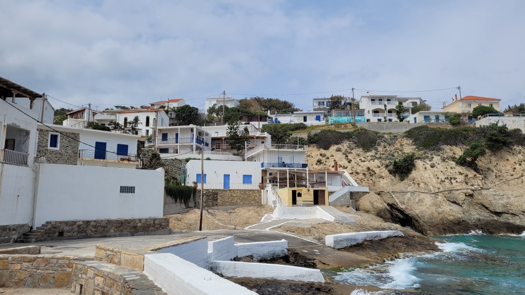 En taxi från piren till ”min by” Souvala och Xanthippi Hotel. Söta och trevliga Vera mötte mig där. Då jag tydligen är enda gästen, inte första gången det händer, är det ingen frukost här i morgon. Härligt ställe, ett stenkast från stranden. Vackert med massor av blommor och grönt.