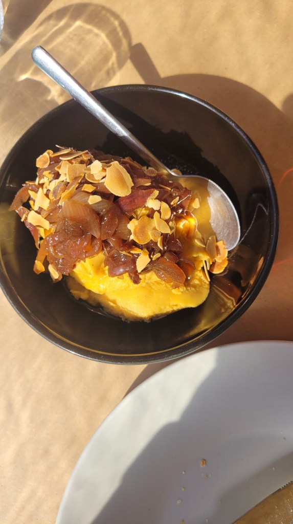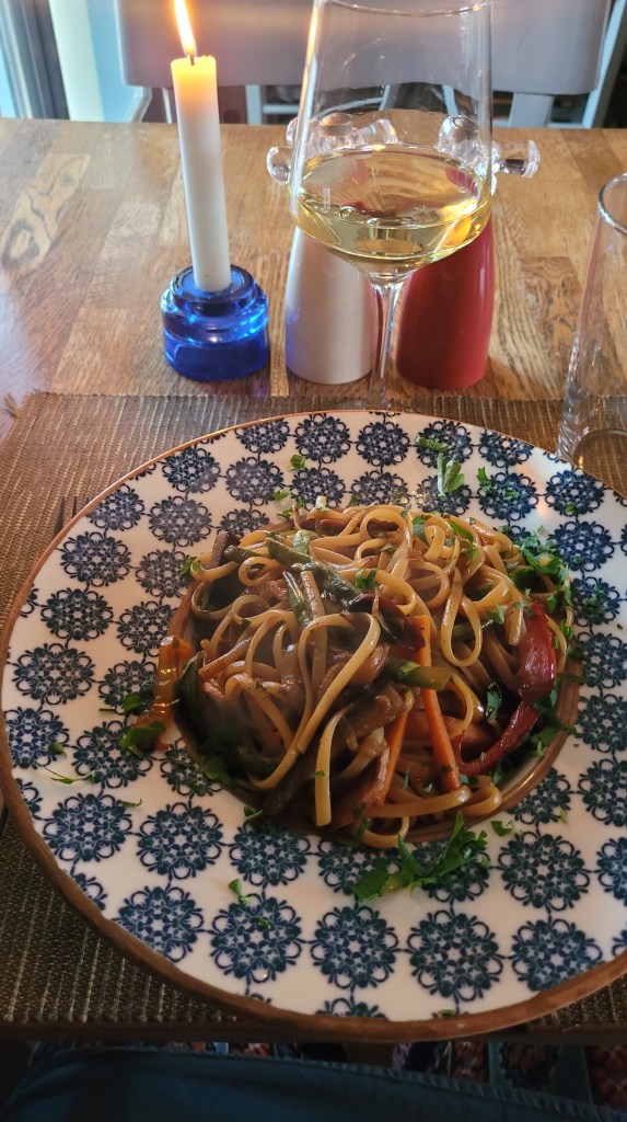 Middagen var supergod, en pastarätt med asiatisk touch, de hade cremé brulée, så klämde en sån. Ett glas vitt till det. Gott, gott, gott.