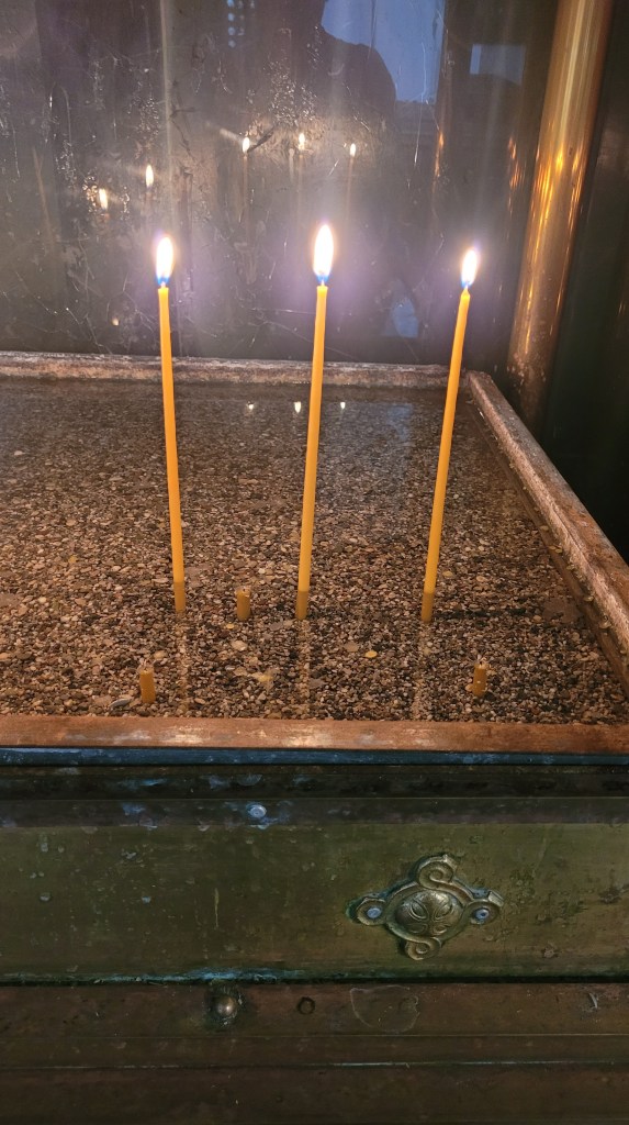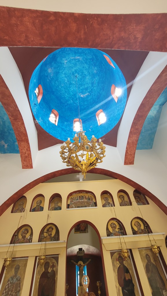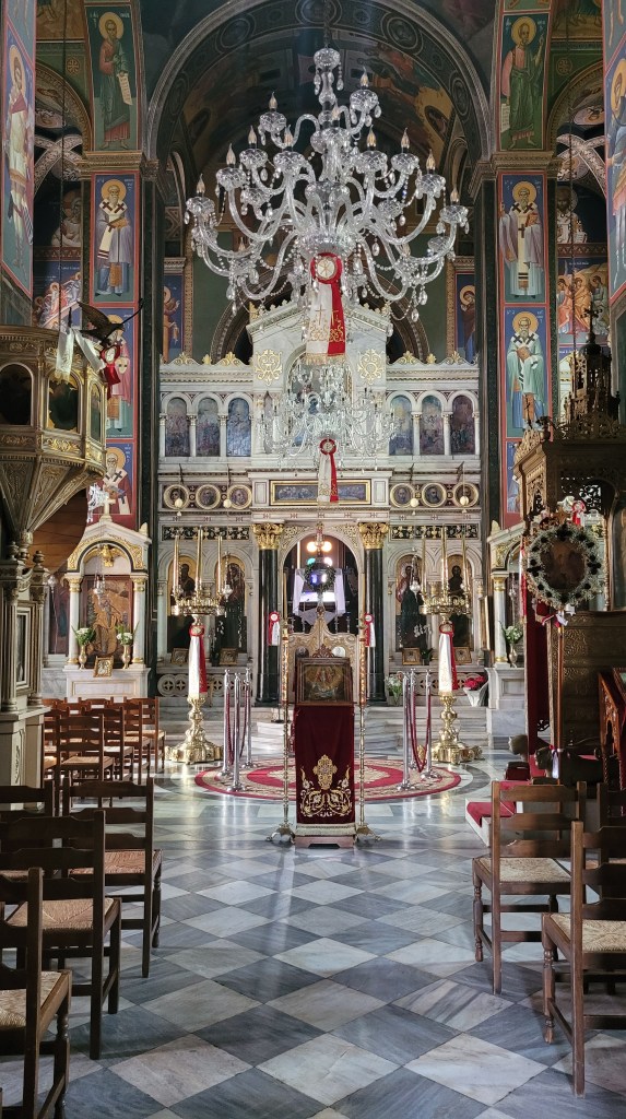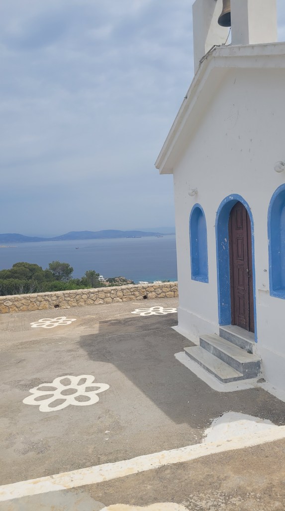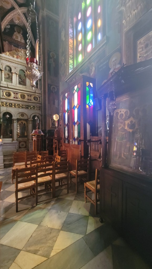 God frulle även idag. Mätt och go tog jag en taxi in till Aegina stad. Spenderade eftermiddagen där. Går man upp några gator från hamnen och hetsen, är det vackra små gator och gränder. Var inne i en vacker kyrka, som var öppen, vilket inte är vanligt.