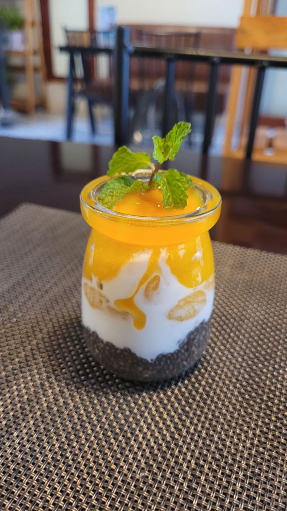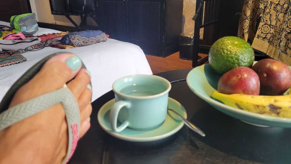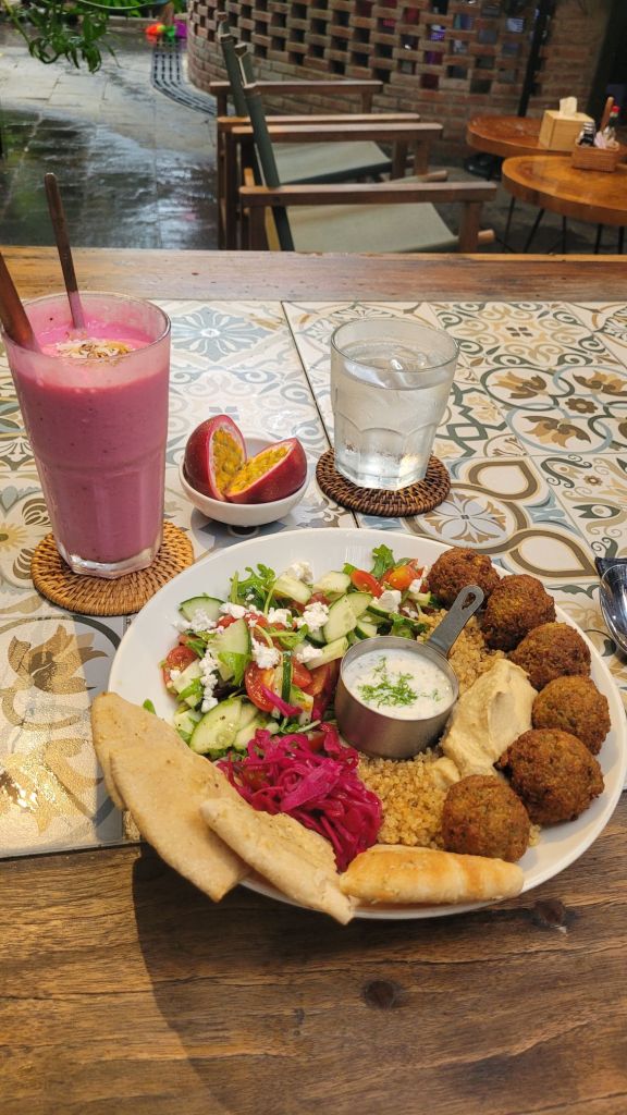 Idag var det verkligen på riktigt regn. I princip hela dagen. Gick i detta regn, mot målet med min promenad. Nourish. Hade varit där innan, då var det stängt. Skulle bara dit. Varför ska en hålla sig nära hotellet, när en kan gå så långt bort man kan. I spöregn….Men så värt besväret med dyngsura gympadojor. Massor av folk, men jag skulle bara in. Blev en Nourish Bowl med falafel, pita, hummus mm. En jättegod smoothie med kokosmjölk, red dragon fruit, mango, banan och passionsfrukt vid sidan. Blev som en dessert. En kaffe på det innan jag gav mig ut igen. Mätt, god och glad.
