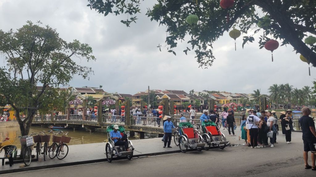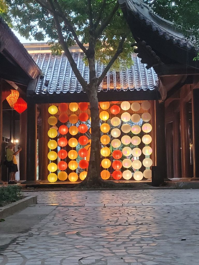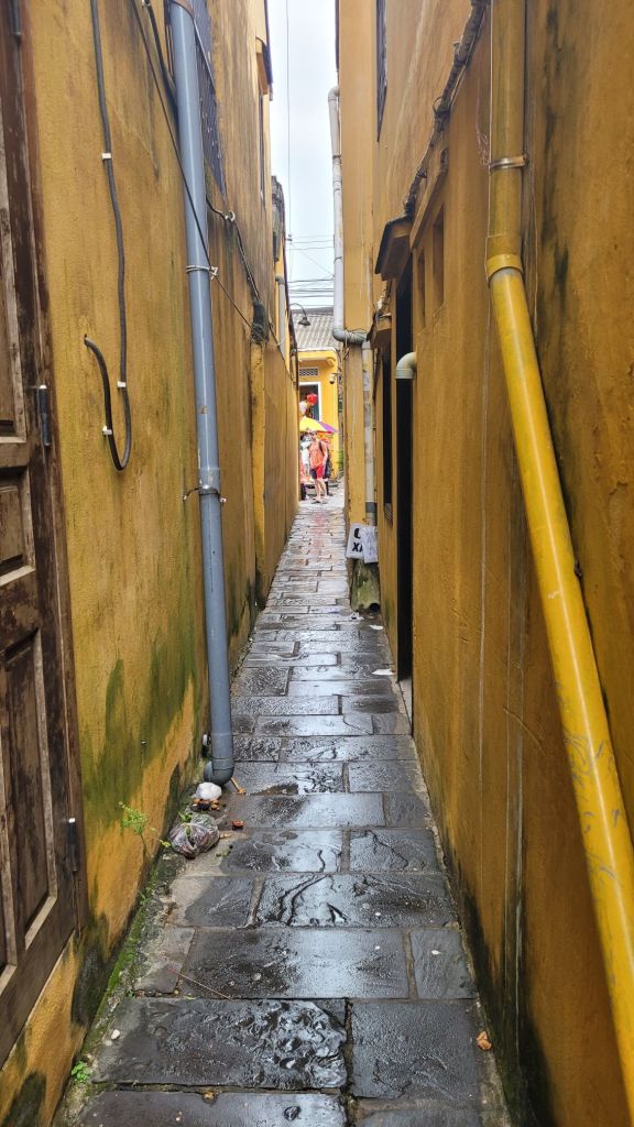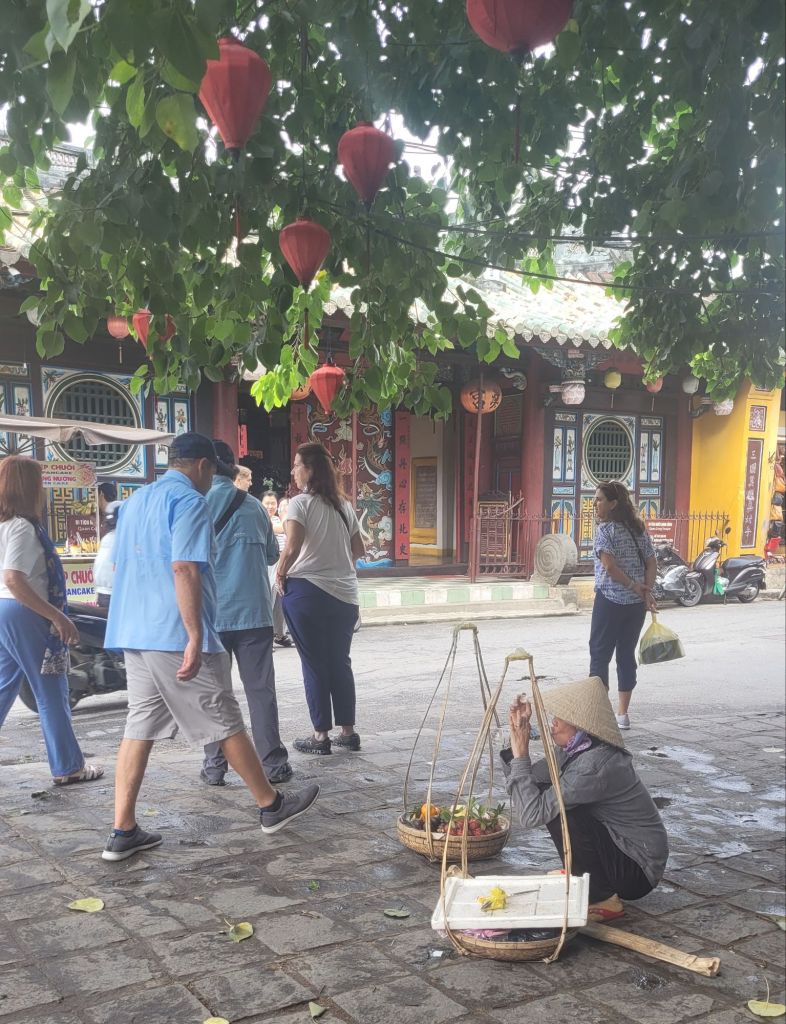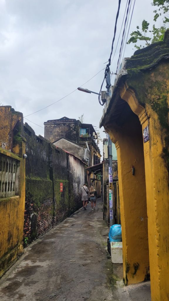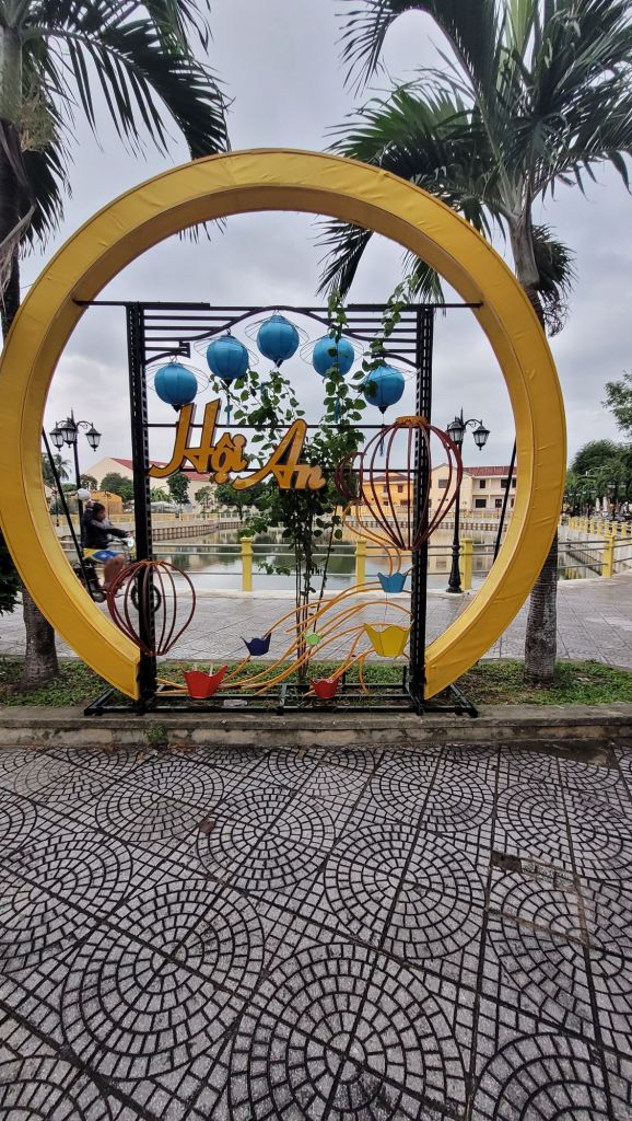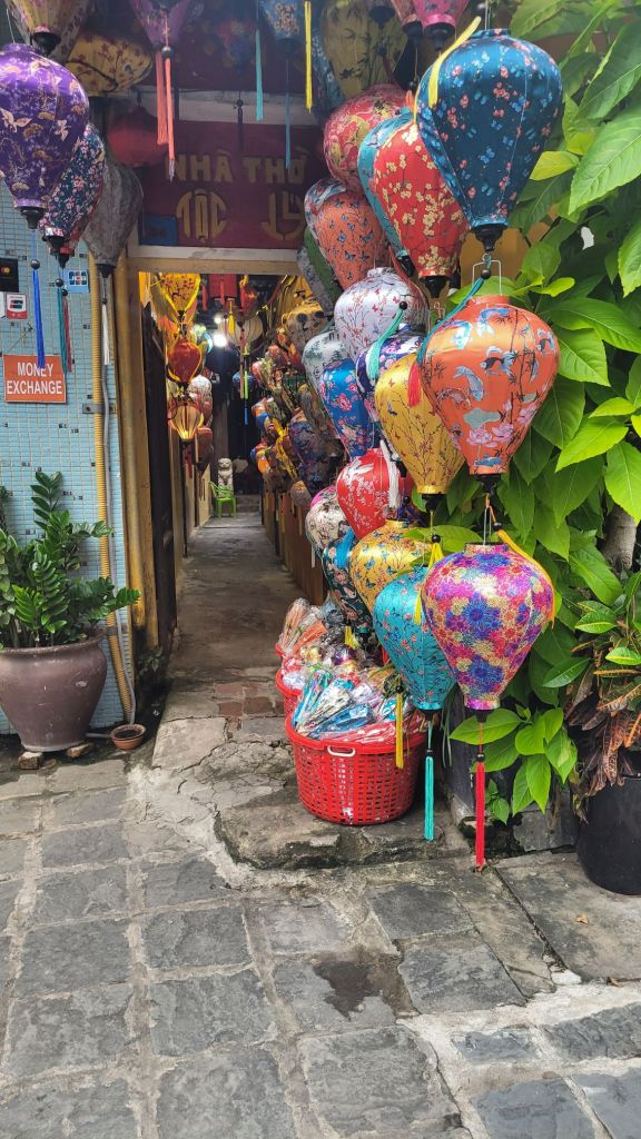 Mycket folk i rörelse. Massor av grupper med guider som bär en pinne, skrikande. På det är det alla ”cykeltaxis” och alla moppar. Lugnt? Nja, det skulle jag väl inte påstå. Härligt när man hittar små gränder, som är så smala så man nästan slår i axlarna. Inte så kul att möte en moppe som kommer i hög fart, då gäller det att trycka sig mot väggen som ett frimärke. Hoi An vinner i längden, även om det är fullt och knökigt med folk. Alla gamla byggnader, gränderna, vackra lyktor. Anio ligger perfekt för mig, som på en höjd mitt mellan stan och stranden med risfälten nära.