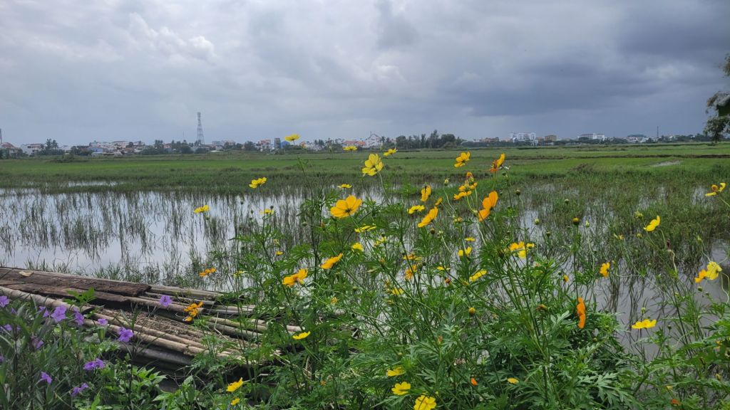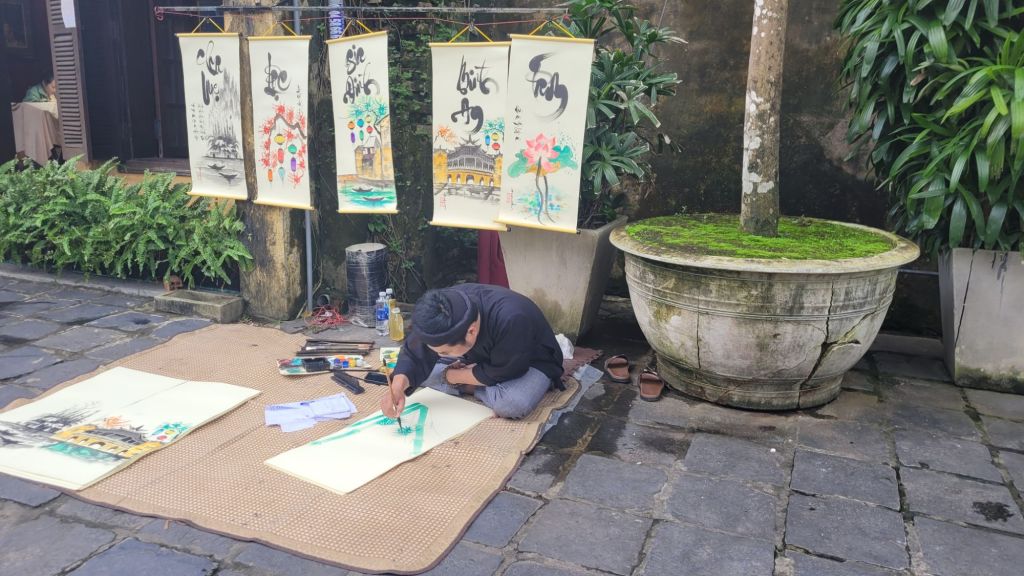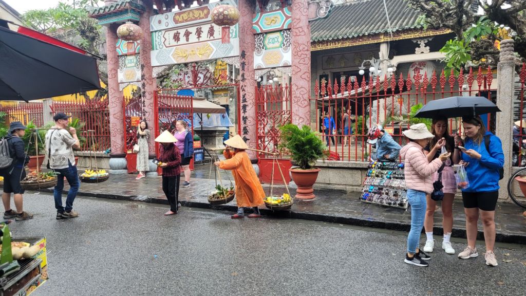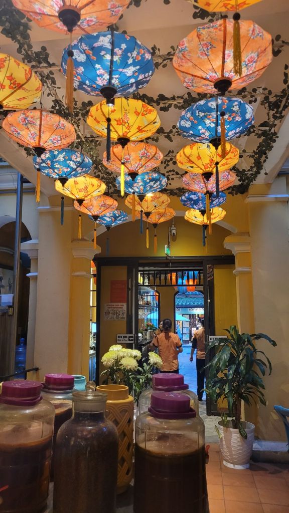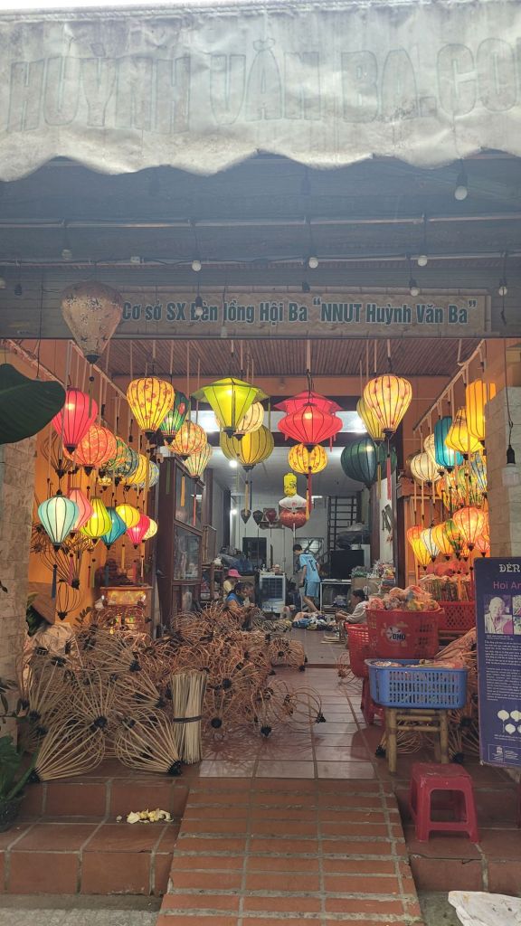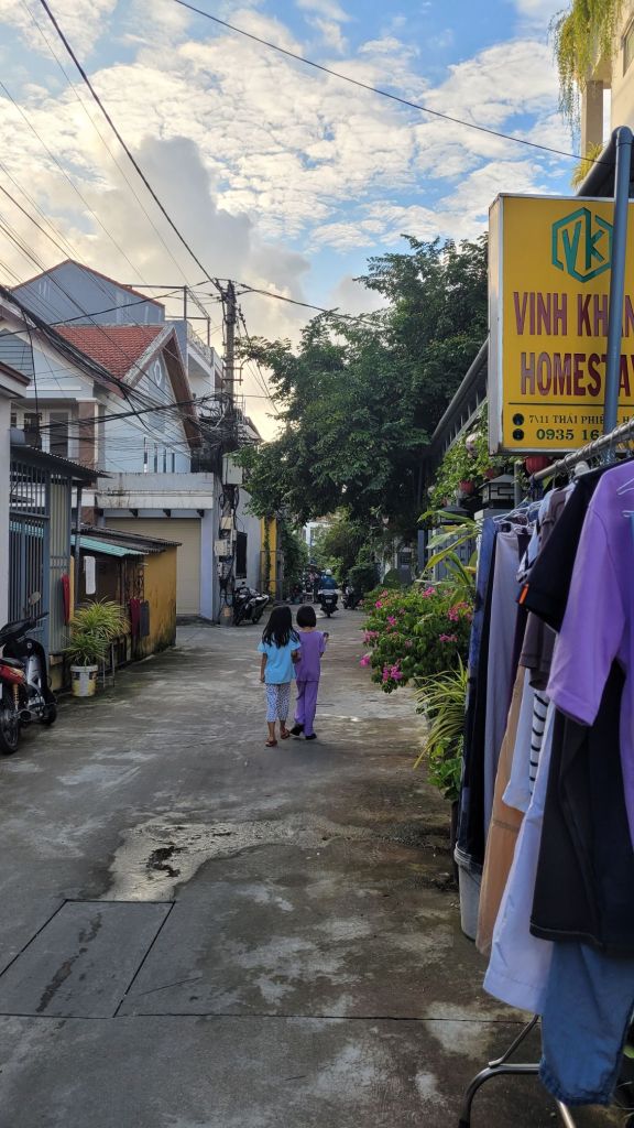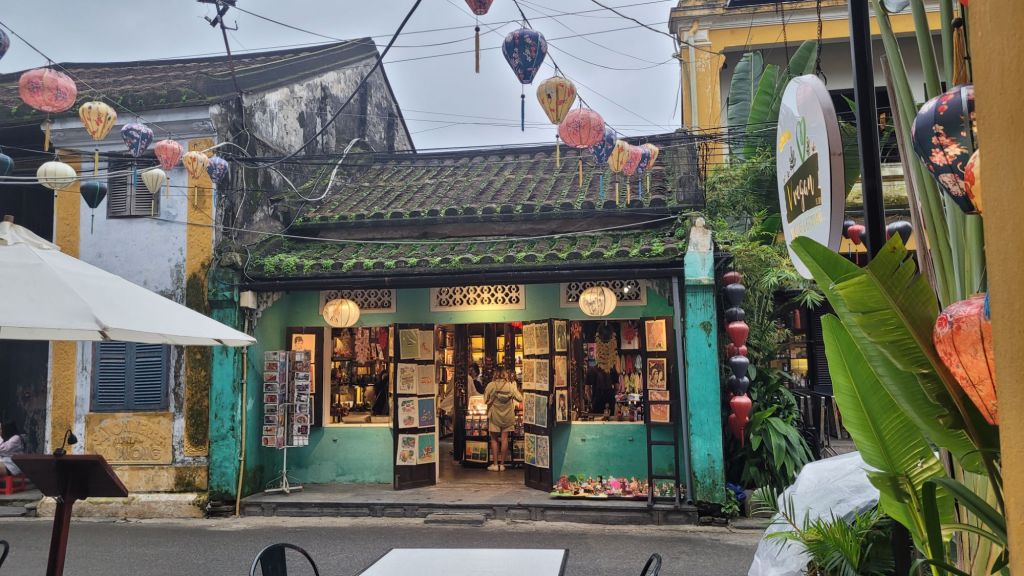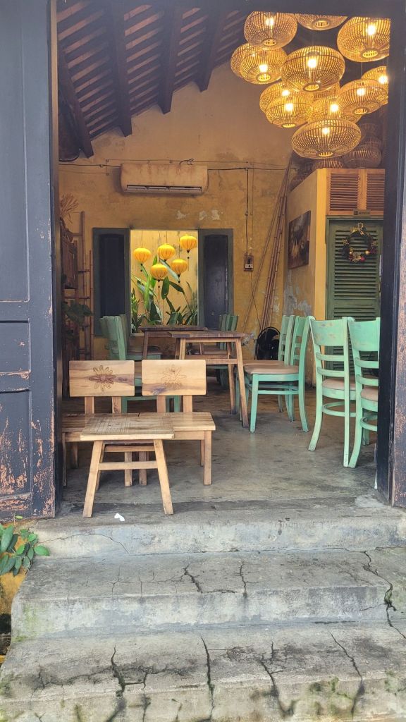 Mycket folk i rörelse. Massor av grupper med guider som bär en pinne, skrikande. På det är det alla ”cykeltaxis” och alla moppar. Lugnt? Nja, det skulle jag väl inte påstå. Härligt när man hittar små gränder, som är så smala så man nästan slår i axlarna. Inte så kul att möte en moppe som kommer i hög fart, då gäller det att trycka sig mot väggen som ett frimärke. Hoi An vinner i längden, även om det är fullt och knökigt med folk. Alla gamla byggnader, gränderna, vackra lyktor. Anio ligger perfekt för mig, som på en höjd mitt mellan stan och stranden med risfälten nära.